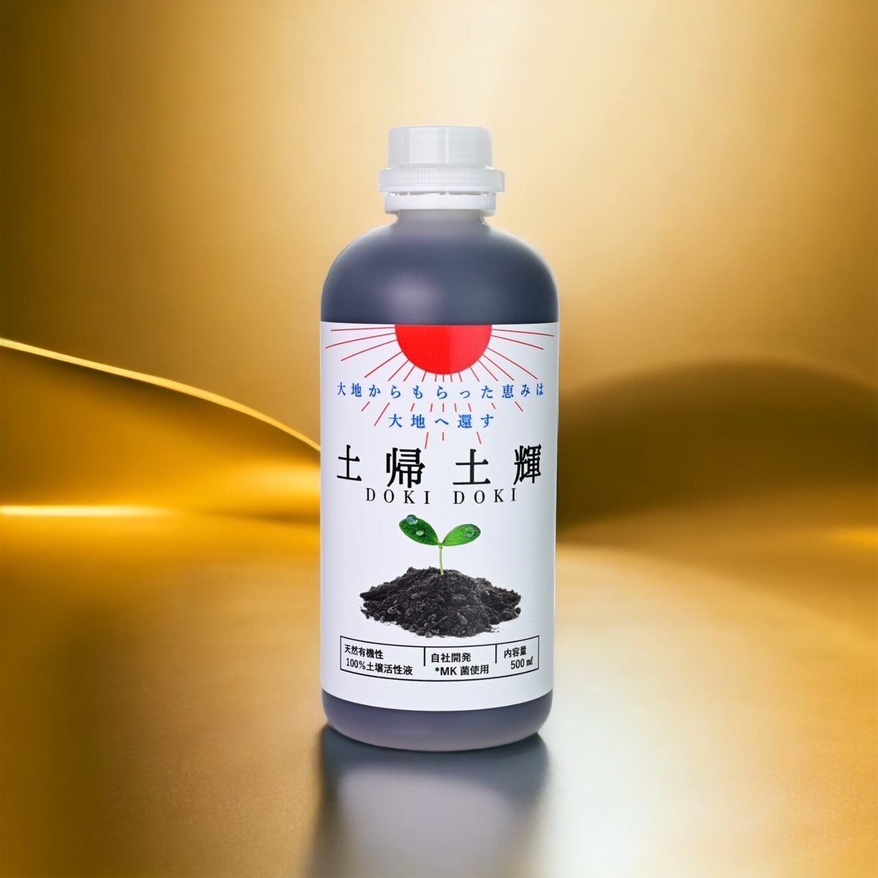 微生物の力で土壌を改善するために、世代を超えて引き継がれるMK菌と完熟鶏糞(自社で6ヵ月間発酵させた鶏糞)・熱帯酵素・米ぬか・燻炭などを原料に独自の配合で製造した100%天然有機性の土壌活性液になります。
